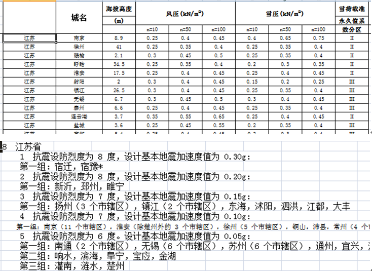 如何根据城市名查出地震设计资料呢?地震设计资料原始数据是按省列出,我们先要根据城市名确定是哪个省的。先用MATCH函数查出城市名所在的行数,再用INDEX函数查得省所有在列那一行是哪个省。由省名再次使用MATCH函数确定该省地震设计资料所在的行号,在要显示地震设计资料的单元格使用INDIRECT(ADDRESS(行号,列号))即可。