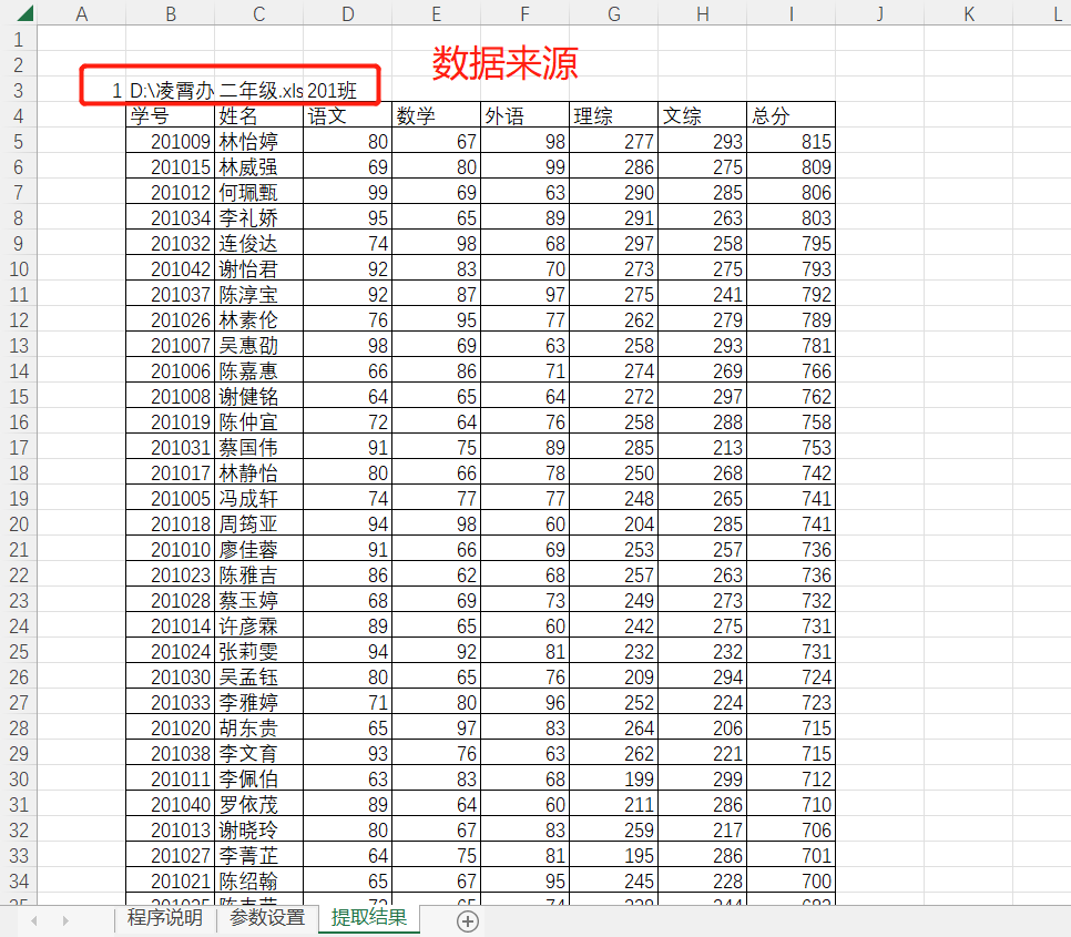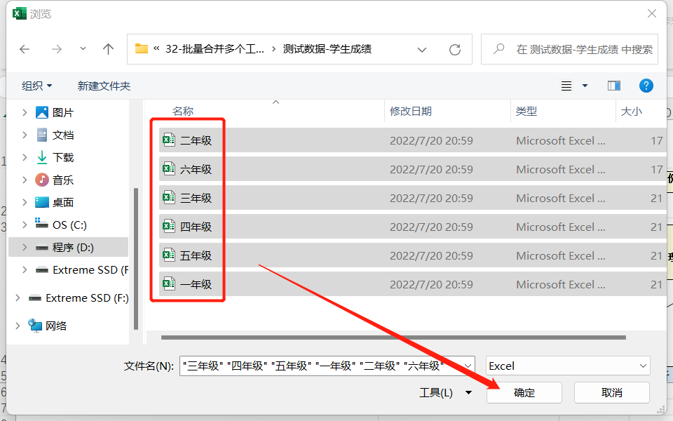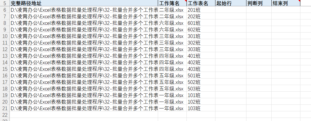 如示例有多个工作簿,包含多个工作表,演示的数据为各年级(工作簿)各班级(工作表学生成绩记录)。因为我们需要将各工作表里面的成绩数据提取处理,合并放置到一个工作表中。如果要合并的工作表有几百个,手动操作需要花费大量的时间精力,所以这里建议可以采用【32-批量合并多个工作表到一个工作表(竖直)】该程序,来快速实现该功能。