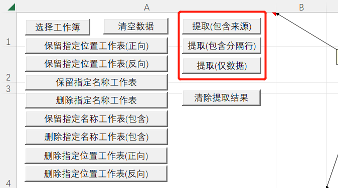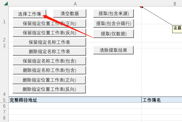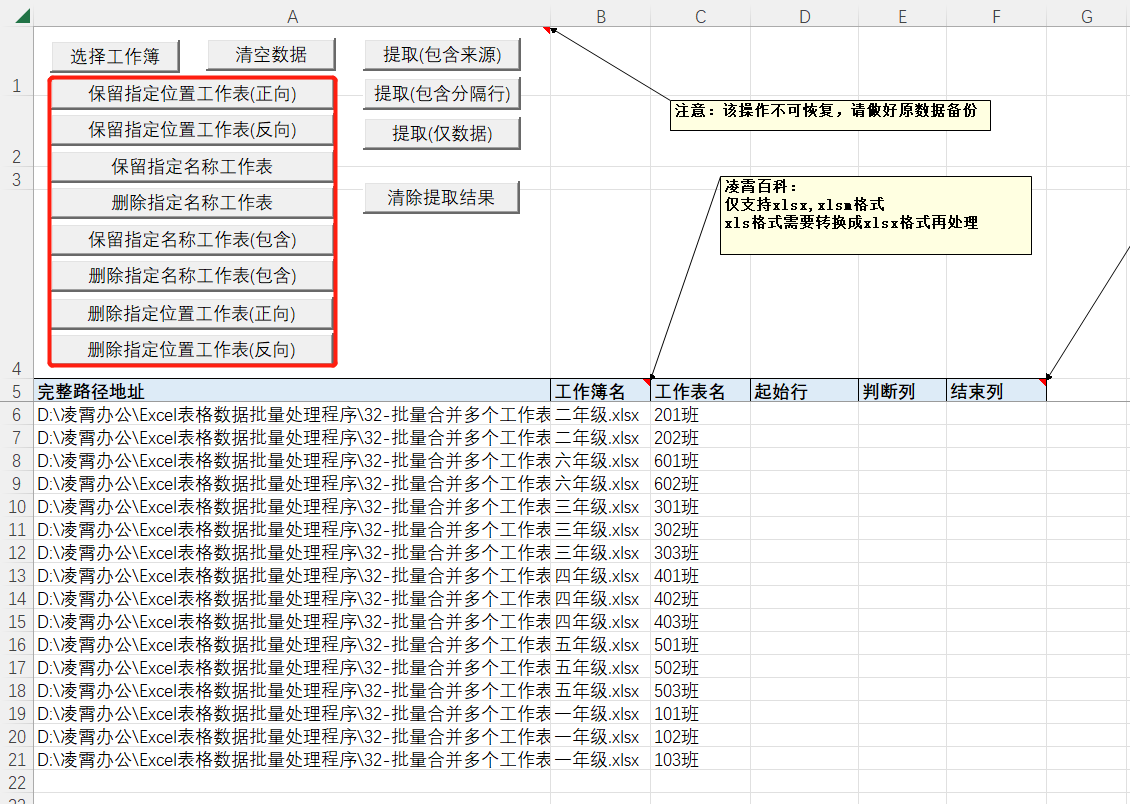 可以通过上方的按钮筛选出待处理的工作表,不需要处理的工作表删除所在行,例如可以实现保留第一个工作表,保留指定名称工作表,删除第n个工作表,删除指定名称工作表等。