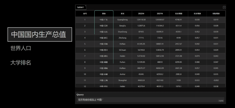 “将整个表以2001年的人口数量从多到少排序。”这种简单排序的命令也能处理,而且速度很快。