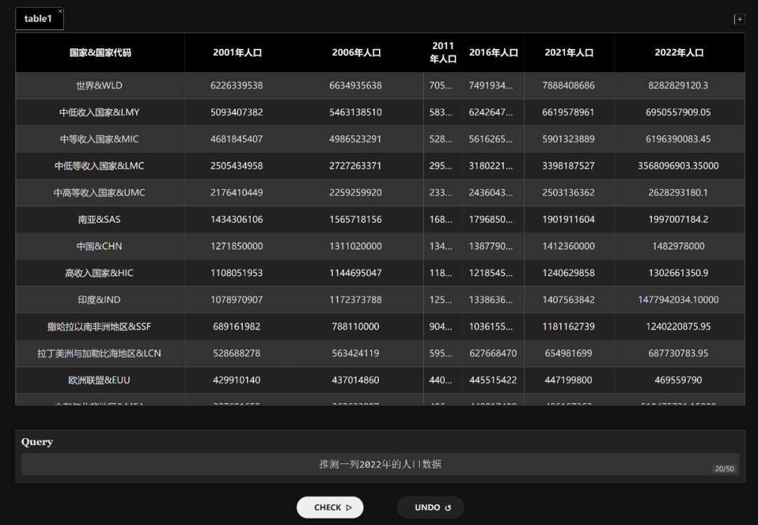 那么对于不存在的数值,这个工具会怎么处理呢?比如说让它根据演示里的数据预测一下2022年的人口数据。尝试使用了一些比较详细的描述,让ChatExcel新生成一列并向里面填充数据,在指令描述比较绕的时候,它并不能给出答案,只是新增了一列,后面的当作没听见。