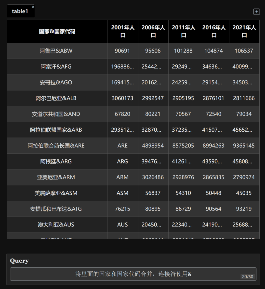 “将里面的国家和国家代码合并,连接符使用&。”对于这个简单的命令,ChatExcel很好地完成了,并且也使用了指定的符号。
