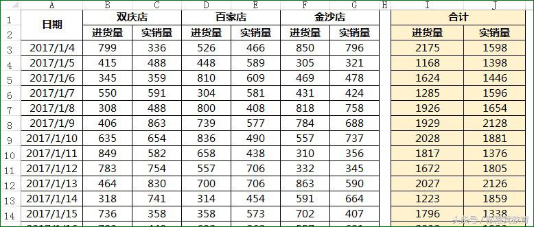 左边是各个分店的进货量和实销量数据,右边需要对当日各店的进货量和实销量汇总。
