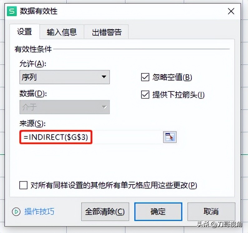 点击需要设置城市下拉列表的单元格,找到【数据选项卡】里的【有效性】,弹出的对话框中将“允许”项选择【序列】,在来源里输入“INDIRECT(G3)”,说实话,这个INDIRECT英文是啥意思咱也不懂,也不敢问,用就完了。