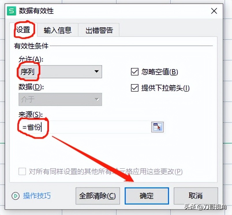 先设置省份,点击需要设置省份下拉列表的单元格,找到【数据选项卡】里的【有效性】,弹出的对话框中将“允许”项选择【序列】,在来源里输入“=省份”,确定即可。