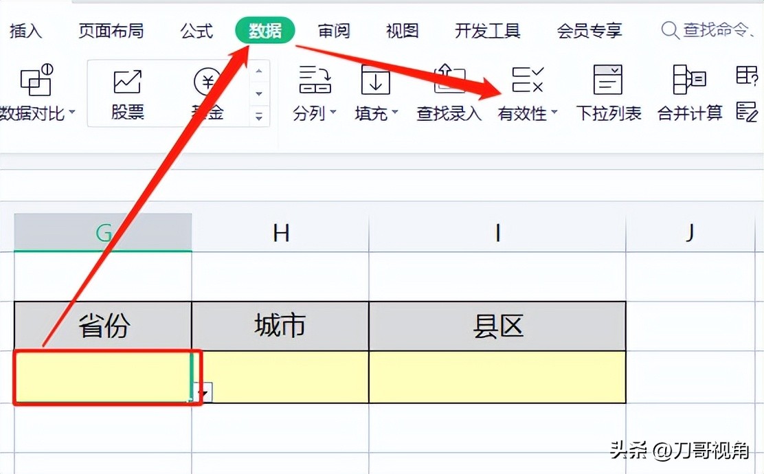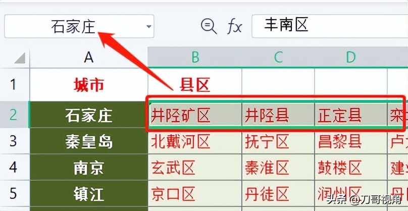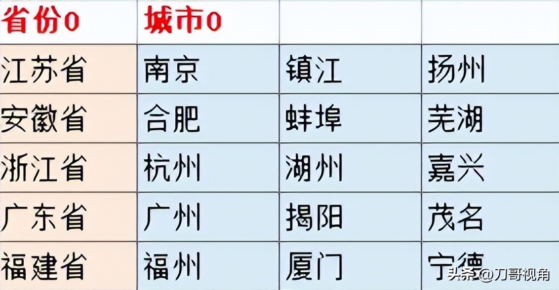 在新建的工作表中按下图格式输入全国所有的省份和对应的地级市,注意所有的省份需在同一行或同一列,这里刀哥习惯放在同一列内,没别的意思,看起来舒服。