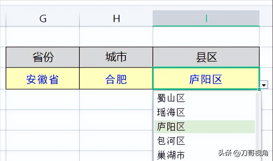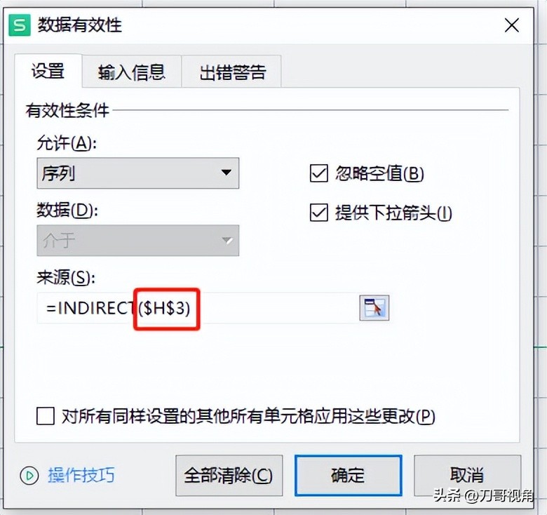 同理,县区单元格的有效性来源里,INDIRECT后面的括号里要写【城市】所在的单元格地址,【H3】。