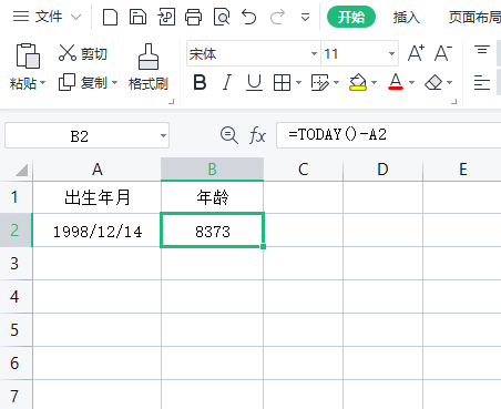 从图1 可以看到,当前日期TODAY()-出生年月A2,得到的是天数。一年365天,所以用天数除以365就得到图2 所示年龄。