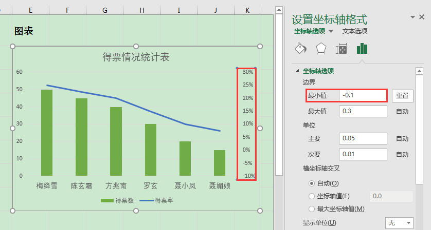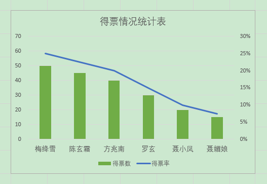 下图左侧为数据源,右侧为根据数据源制作的柱形-折线组合图表。图表中系列"得票数"用绿色柱子显示,系列"得票率"用蓝色折线显示。当前图表中的柱形与折线发生重叠,接下来我们想要将柱形与折线进行分离,使图表显示更加美观。
