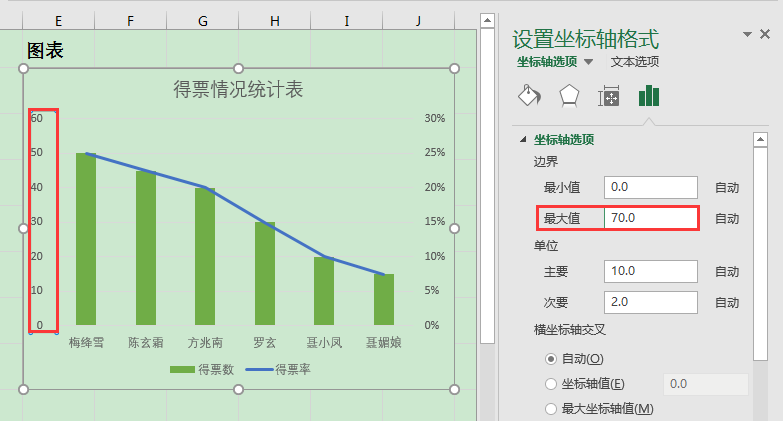双击图表最左侧的主要纵坐标轴,在工作表右侧弹出[设置坐标轴格式]对话框,在[坐标轴选项][边界]下将[最大值]调高,设为"70.0"。此时,可见图表中绿色柱形的高度整体往下压低,实现了柱形与折线的分离。