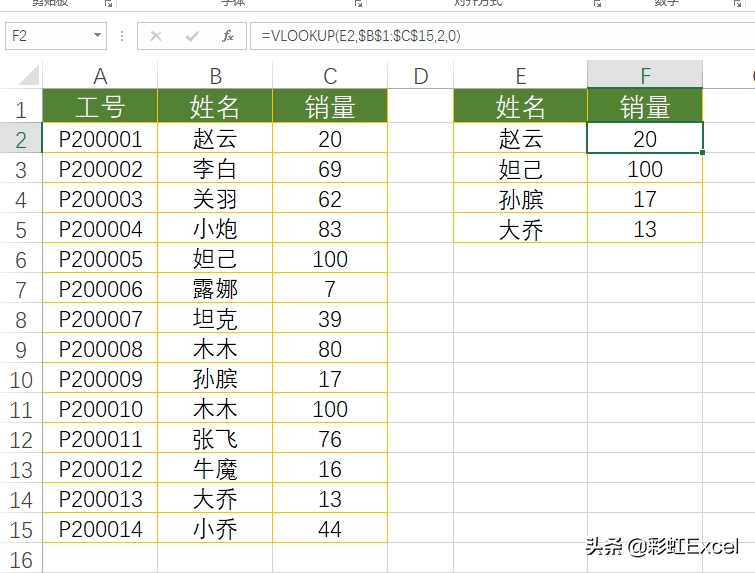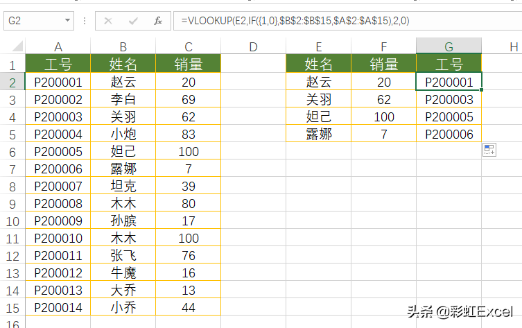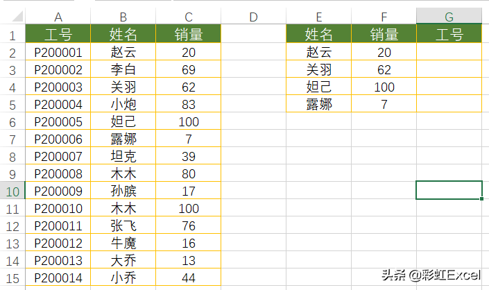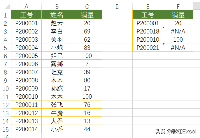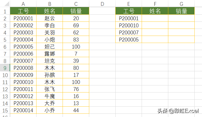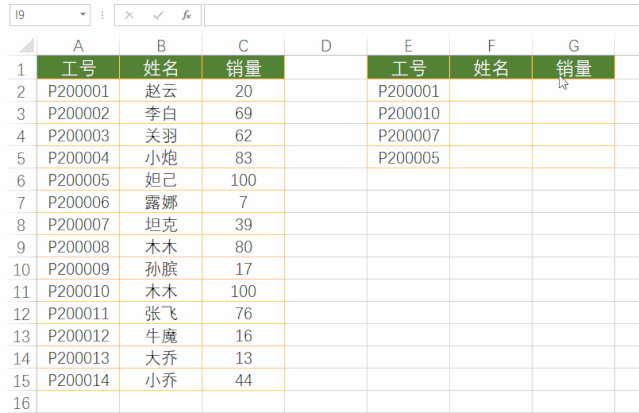 比如如下,我们想根据工号,分别输出姓名和销量,要如何快速实现呢?