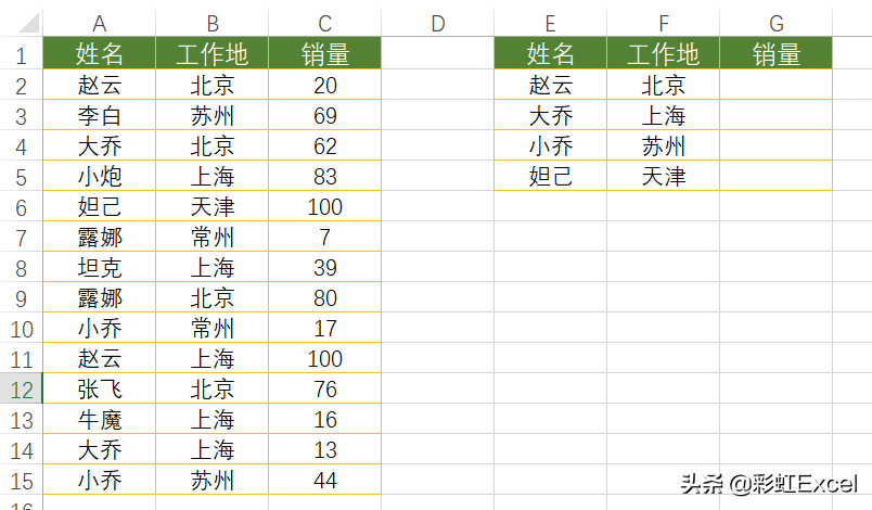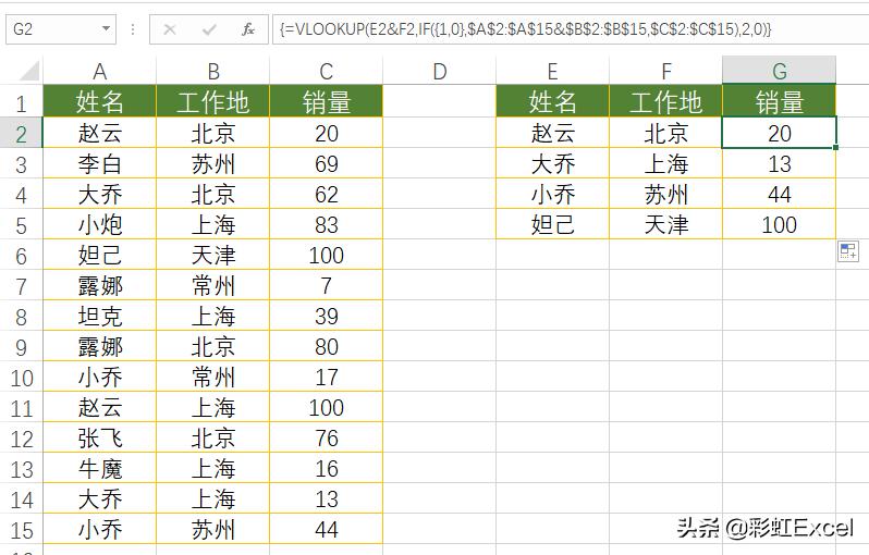 比如我们有如下数据,想根据姓名及所在地区查询其对应的销量