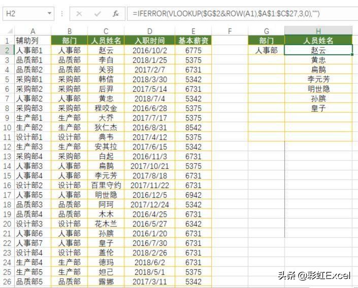 因为我们的辅助列是把部门和其出现的次数,所以此处的查找值是结合ROW函数来使用的。