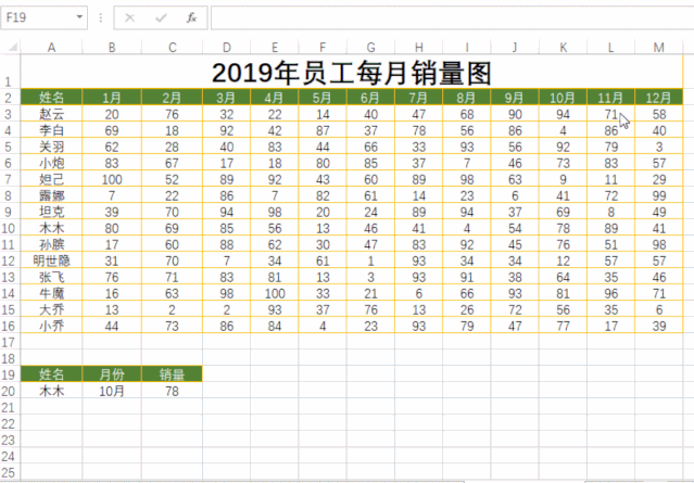 我们有2019年员工每个月的销量数据,如果我想根据员工的姓名及月份查询其对应的销量,要如何去做呢?