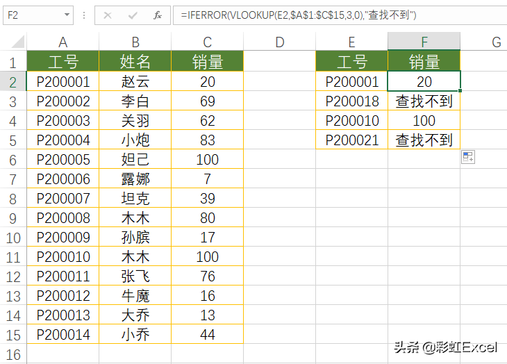 =IFERROR(VLOOKUP(E2,$A$1:$C$15,3,0),"查找不到")