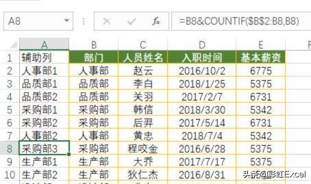 COUNTIF($B$2:B2,B2)即统计B2单元格内容在区域$B$2:B2出现的次数,可以看到第一个B2是锁定的,代表随着公式的拖动,B2单元格内容出现的次数是依次累加的,再和B2合并,即实现了部门内容的唯一性。
