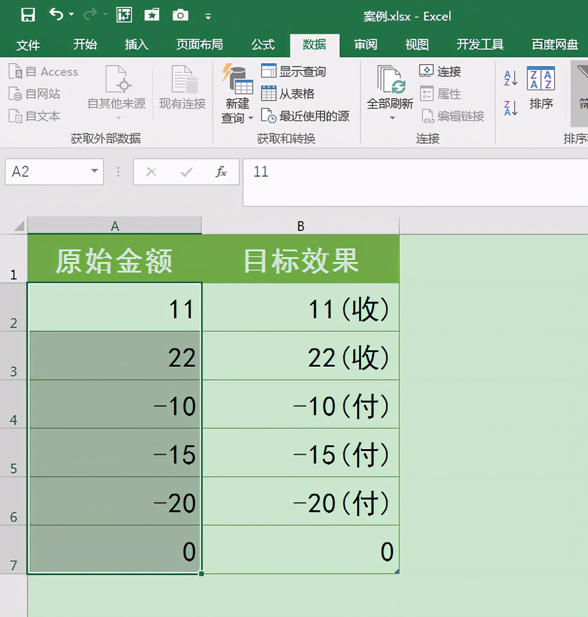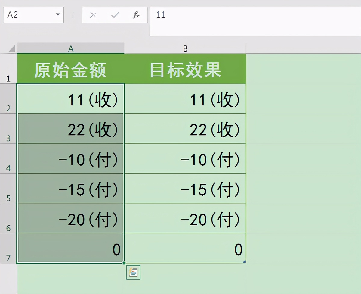 根据下图Excel工作表A列中金额数值的不同,为其添加不同的文本后缀。如果金额数值大于0,在后面添加“(收)”;如果金额数值小于0,在后面添加“(付)”;如果金额数值等于0,则保持不变,显示为0。参考显示效果见工作表B列。