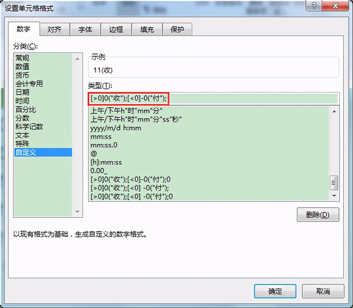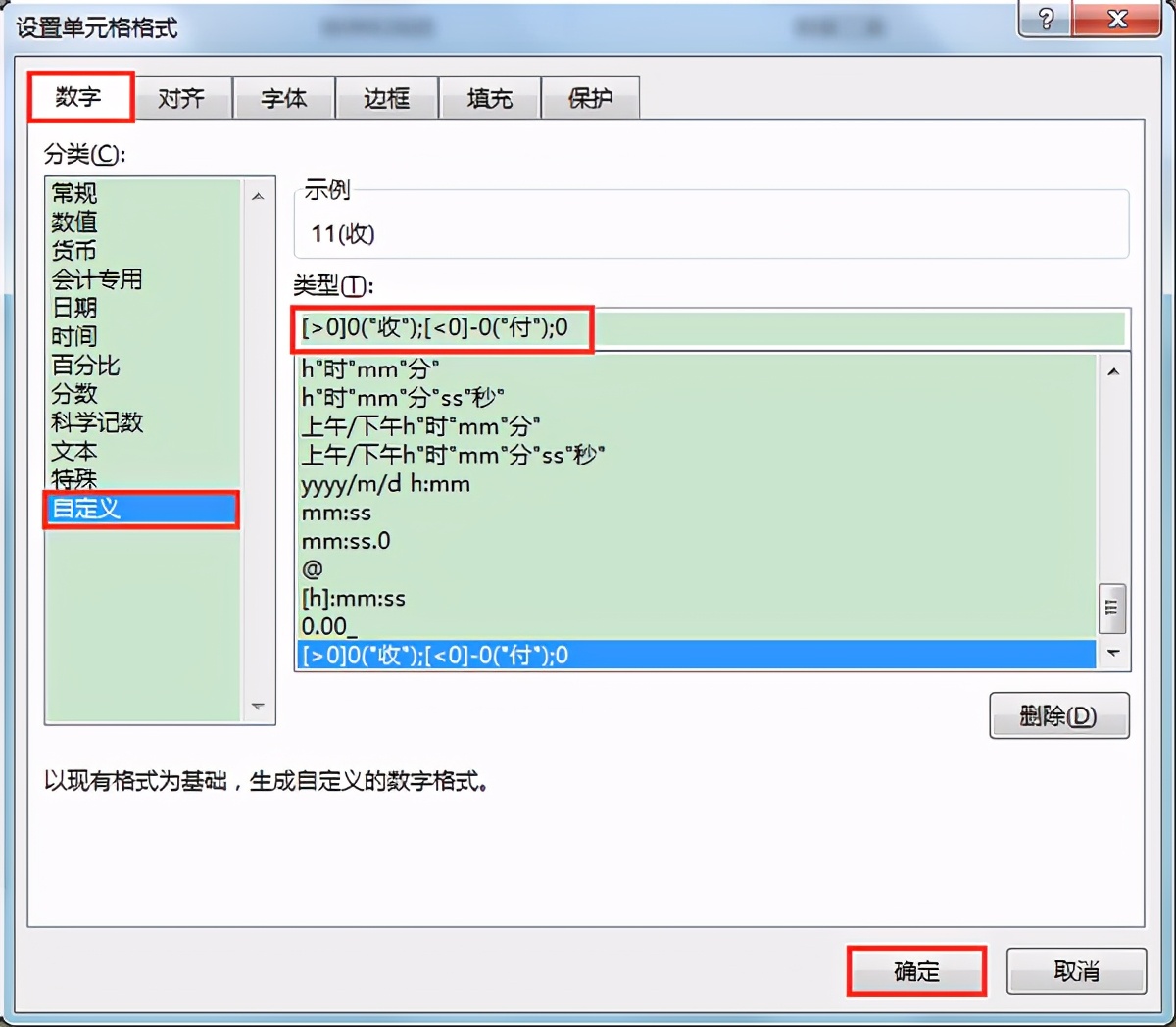 2.在“设置单元格格式”对话框中,在“数字”选项卡下选择“分类”下面的“自定义”。在右侧的“类型”编辑框中输入格式代码:[>0]0("收");[<0]-0("付");0。最后单击“确定”按钮,这样A列中的金额数值就显示为我们想要的目标格式了。
