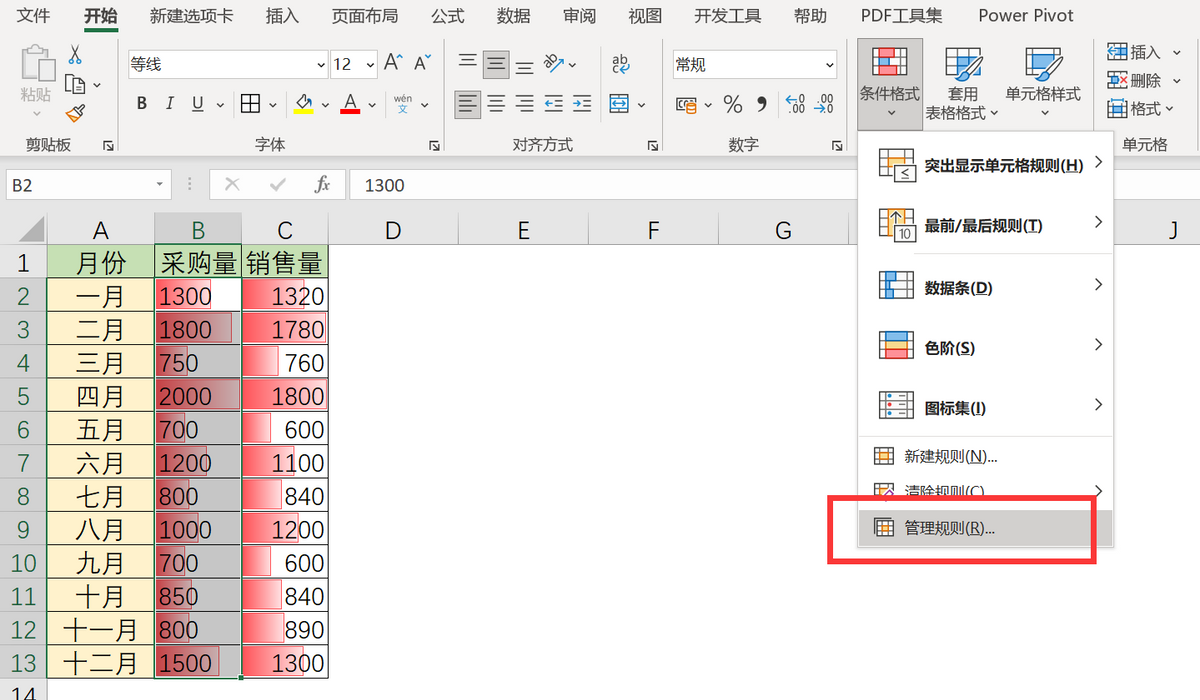 现在两列数据根据各自单元格内数据值的大小生成了颜色数据条。但两列单元格的数据条都是从左到右,需要将B列调整为从右到左,选中B列,点击菜单栏上“开始-条件格式-管理规则”。