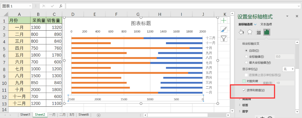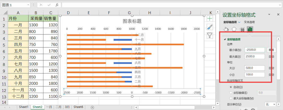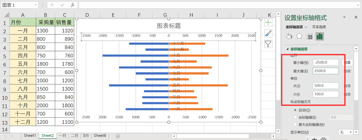 同样的方式,设置上方坐标轴的边界值,最大值和最小值。设置完成后,我们的图表在同一条线上反方向显示出两列数据的条形图了。