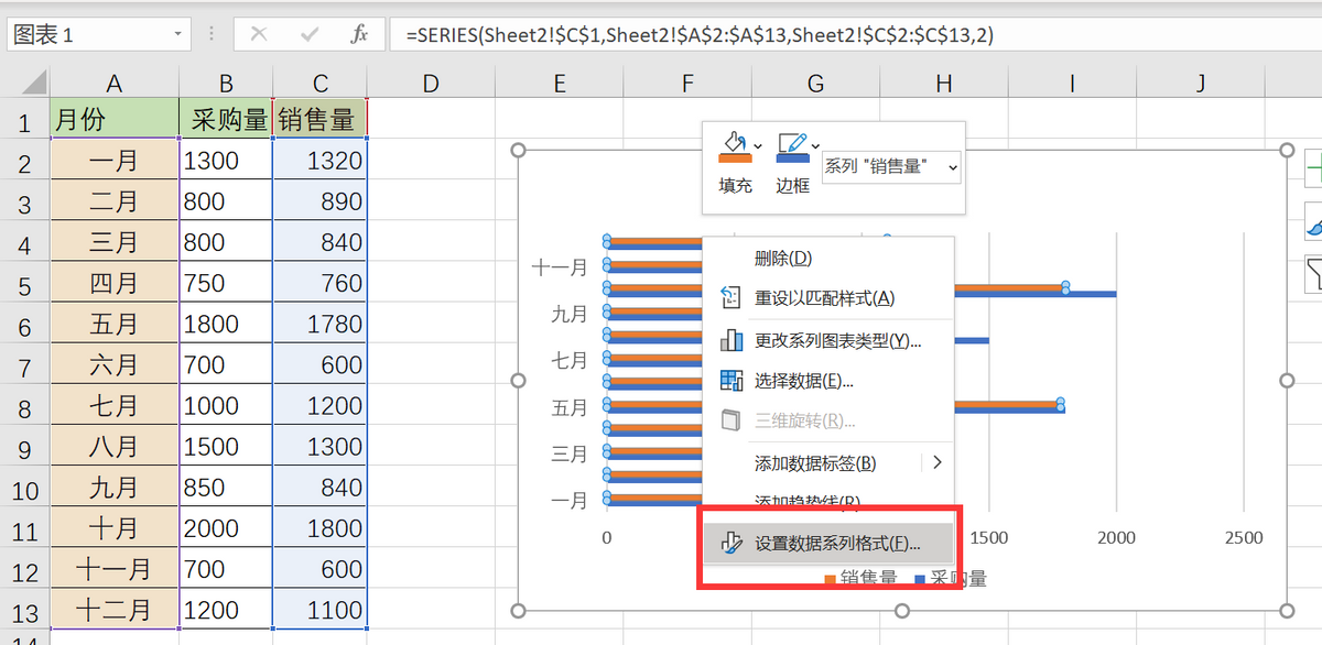 点击确定后,表格里生成一张两个颜色的条形图。选中黄色的条形,点击鼠标右键,选择“设置数据系列格式”。