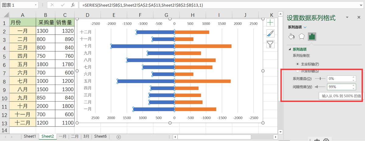选择条形图,右侧切换到“设置数据系列格式”窗口,点击“间隙宽度”调整百分比,可调整条形图的粗细,同样的方式调整左右条形图的粗细,并保持一致。