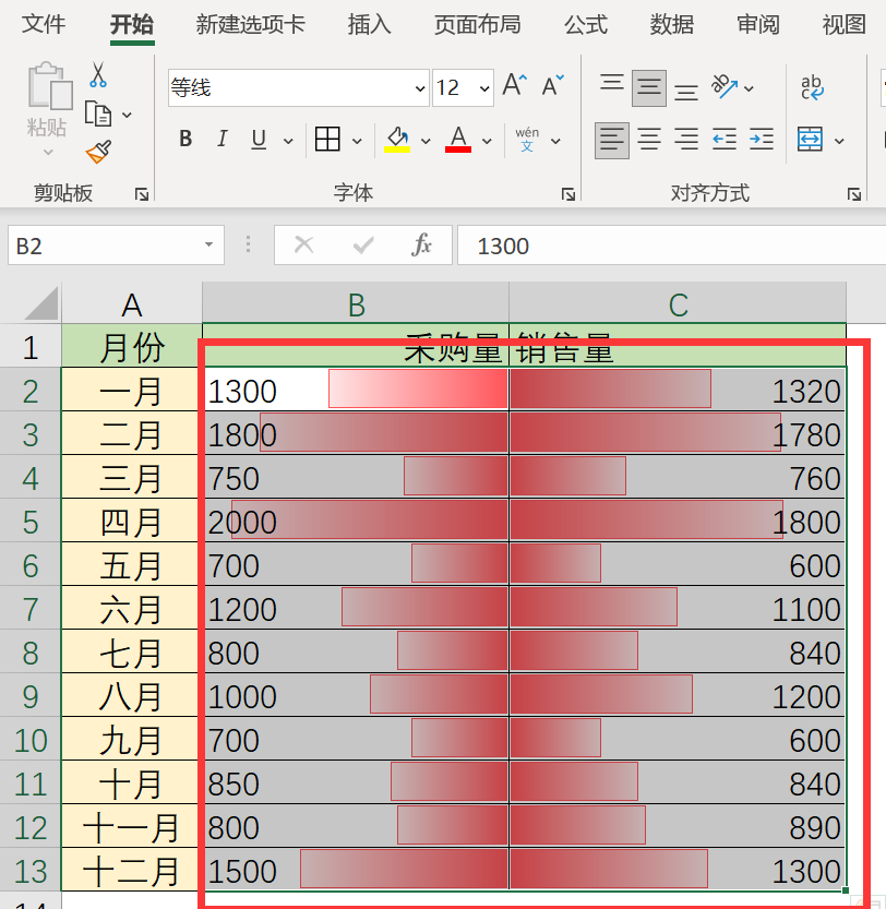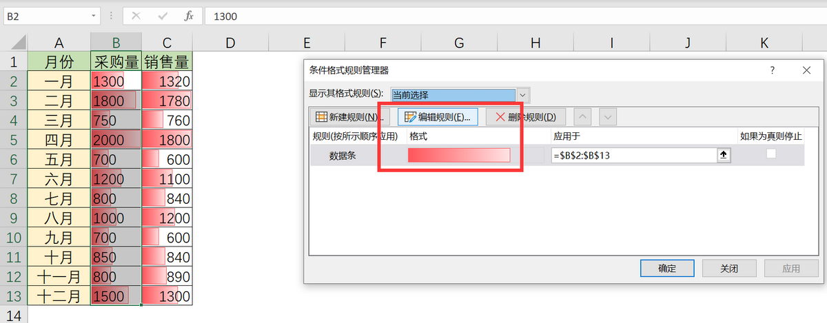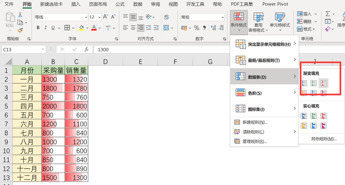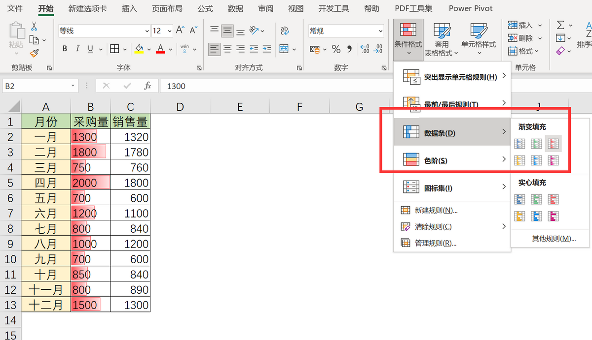 准备好表格数据后,选中B列也就是采购量,点击菜单栏上“开始-条件格式-数据条”选择一个喜欢的颜色。