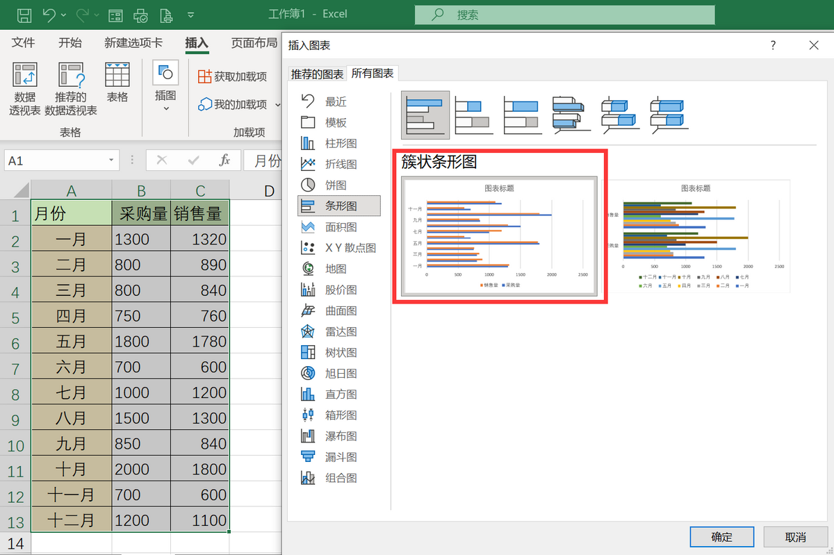 选中整个表格,点击菜单栏上“插入-图表-条形图-簇状条形图”。
