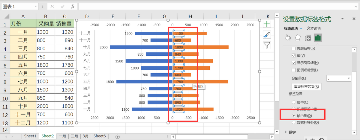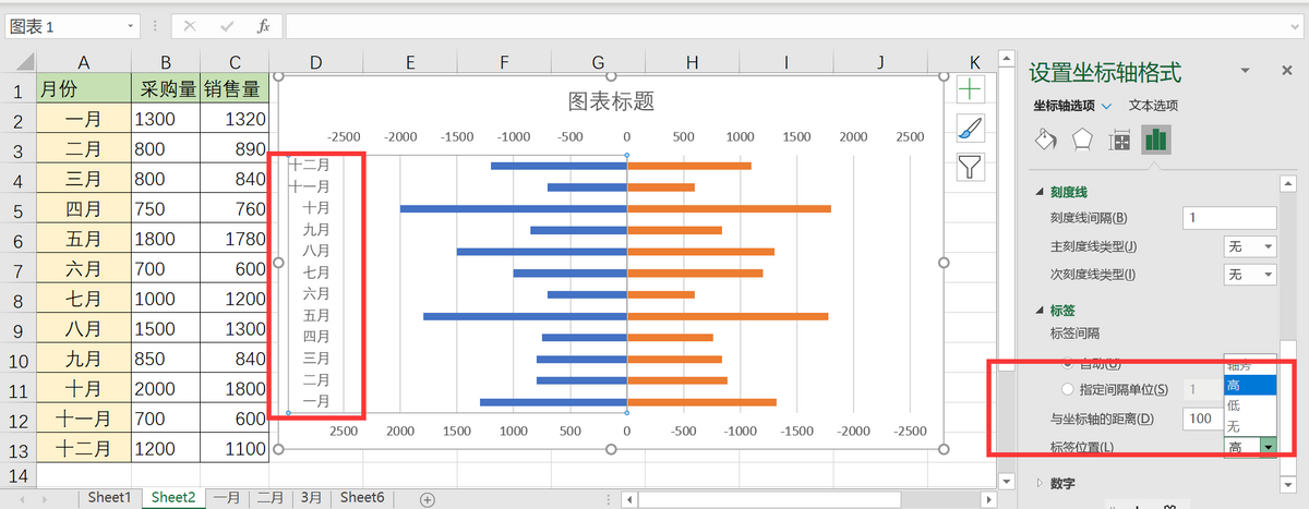 点击纵坐标轴,也就是中间的月份,右侧切换到“设置坐标轴格式”窗口,点击底部的标签,选择“高”,月份数据移动到了左侧。