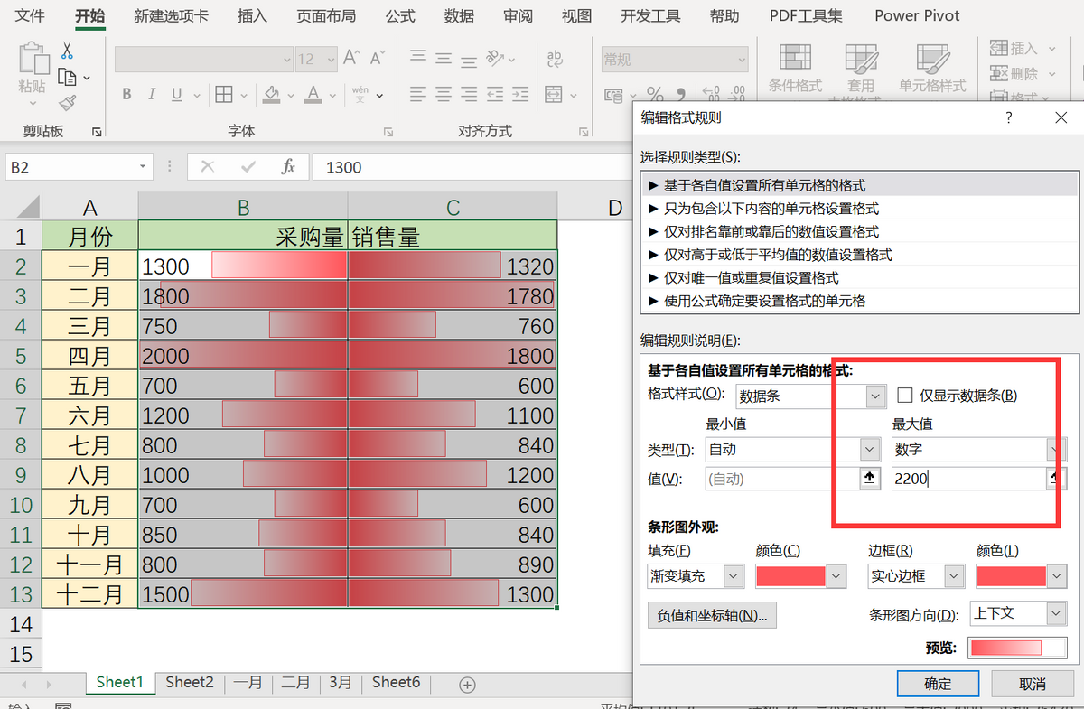 依次选中B、C两列,按前面的步骤,打开“编辑格式规则”窗口,修改最大值为数字,输入比每一列里最大值要大点的数字。