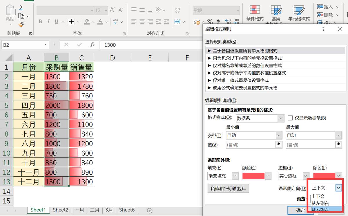 弹出窗口,点击右下角“条形图方向”,下拉选择“从右到左”。