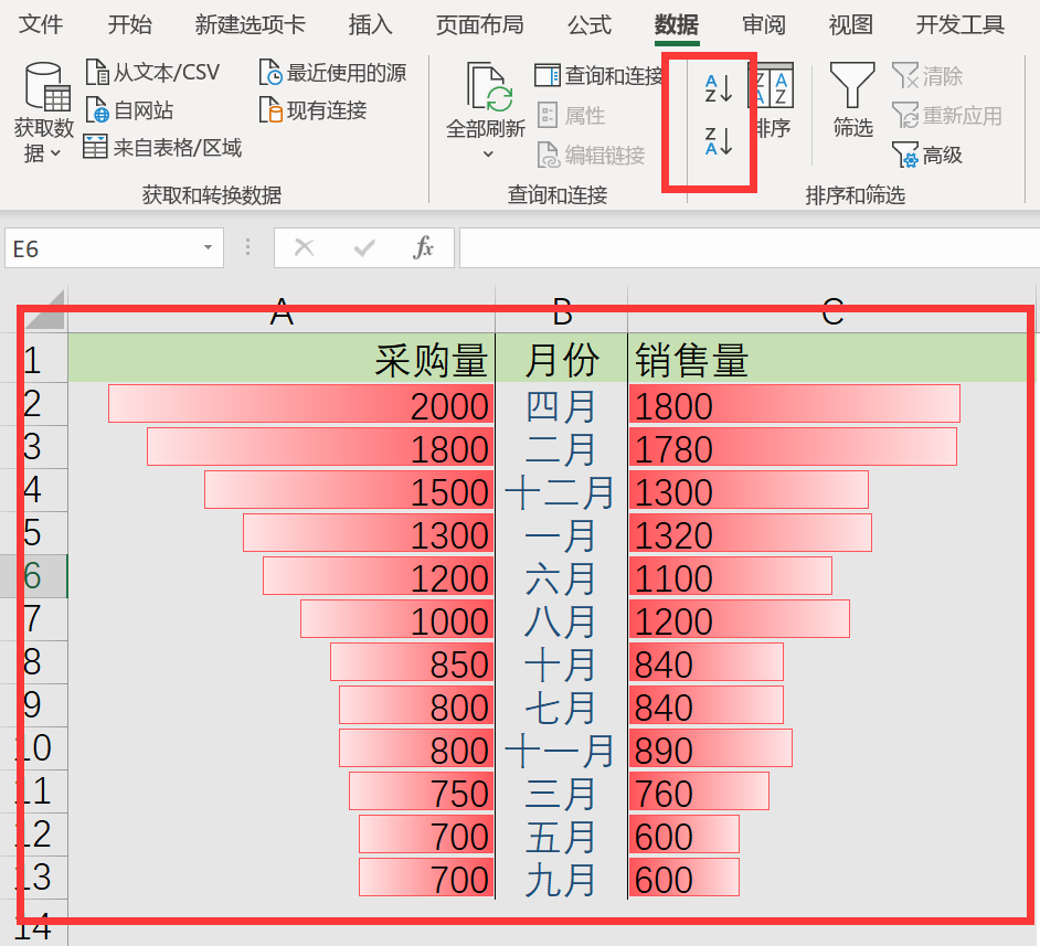 选中表格里的数据列,点击菜单栏上“数据-排序-升序或降序”。右侧的图表也会随着表格数据排序而自动调整条形图顺序,从而显示为递减条形,让图表看起来更加好看更加直观。