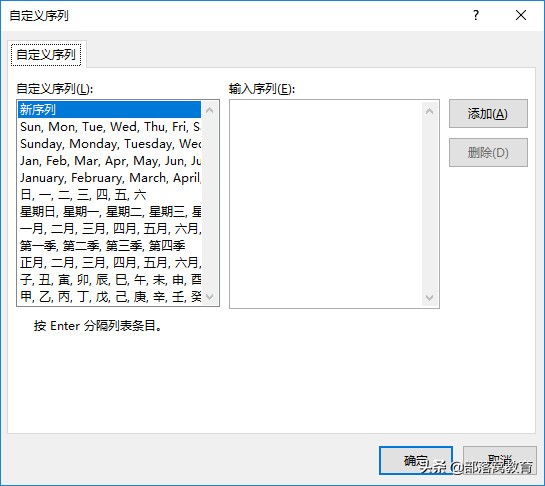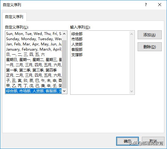 在“输入序列”的区域中,制作我们需要的序列。比如我们要做一个部门的序列,在“输入序列”的区域中,按照顺序依次输入部门名称,每个部门名称按回车键分隔。输入完成后单击“添加”,在左侧的“自定义序列”中就会出现刚刚添加的序列。如图18所示。
