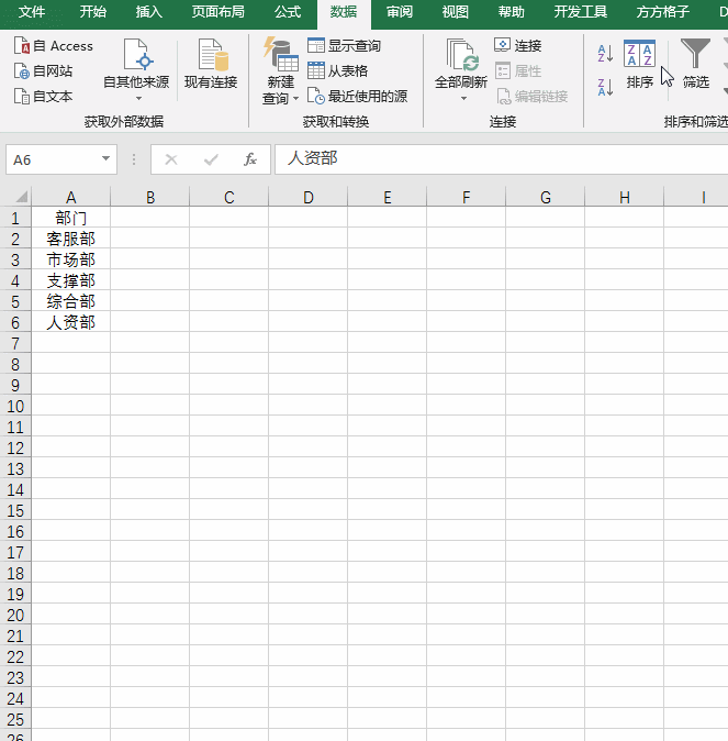 扩展功能:除了上述讲到的用法外,利用自定义序列排序,还可以让部门名称通过下拉的方式出现,如GIF20所示。