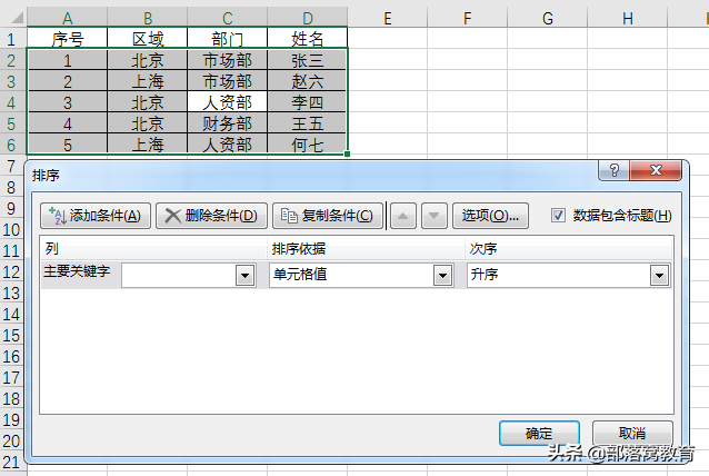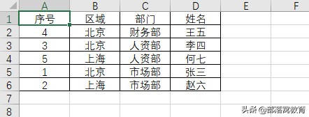 我们在进行多列排序的时候,经常会碰到这样一类问题:如果有两列数据都需要进行排序,我们怎么区分主次呢?如图4所示,需要将下面这张表先按照“部门”排序,再按照“区域”排序。
