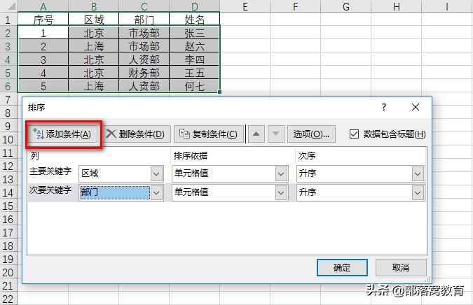 我们把需要设置的排序条件都添加进设置框内,添加完一个条件之后,单击“添加条件”就可以添加第2个条件,如图7所示。
