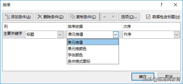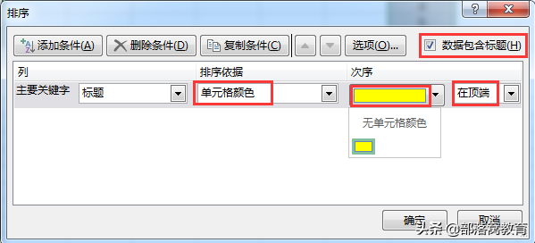在“数据”选项卡中,点击“排序”,进入“排序”的设置框。由于我们的数据是有标题的,所以要勾上“数据包含标题”。接着把“排序依据”设置为“单元格颜色”,“次序”可以根据需求,选择是先排有颜色的数据,还是无颜色的数据。这里我们设置将有颜色的单元格排在顶端。如图12所示。