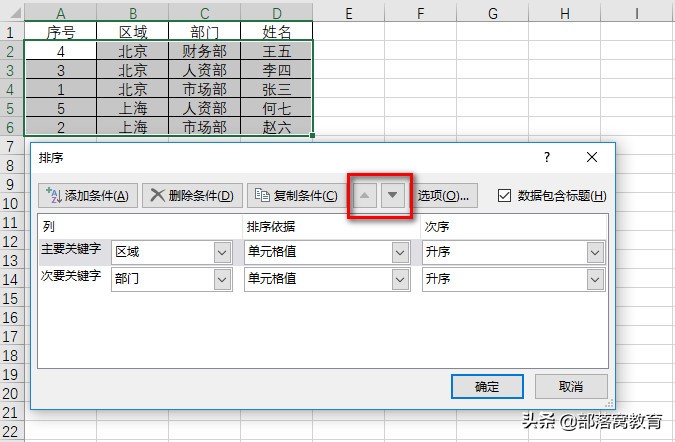 由于我们开始要做的是一个先按“部门”排序,再按“区域”排序的表格,想要达到这一效果,就需要变更主次关键字。怎么变更呢?只需单击排序窗口的小三角即可,如图9所示。