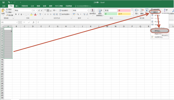 那么如何输入等比序列呢?在选项卡“开始”点击“填充”,再选择“序列”。