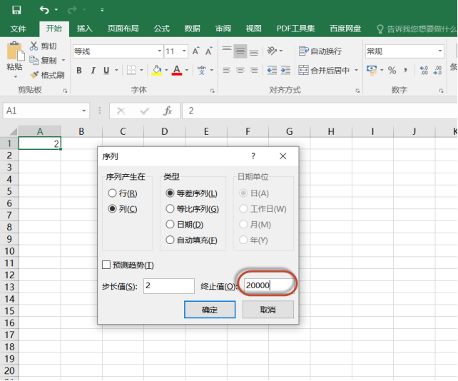 如果等差或等比数列有几万行或者更多,用拖动的操作效率就很低了。怎么办?只需要在单元格输入等差或等比数列的第一个数字,在序列对话框中,“步长值”输入步长,“终止值”输入最后一个数字,就可以快速输入几万行的数据。