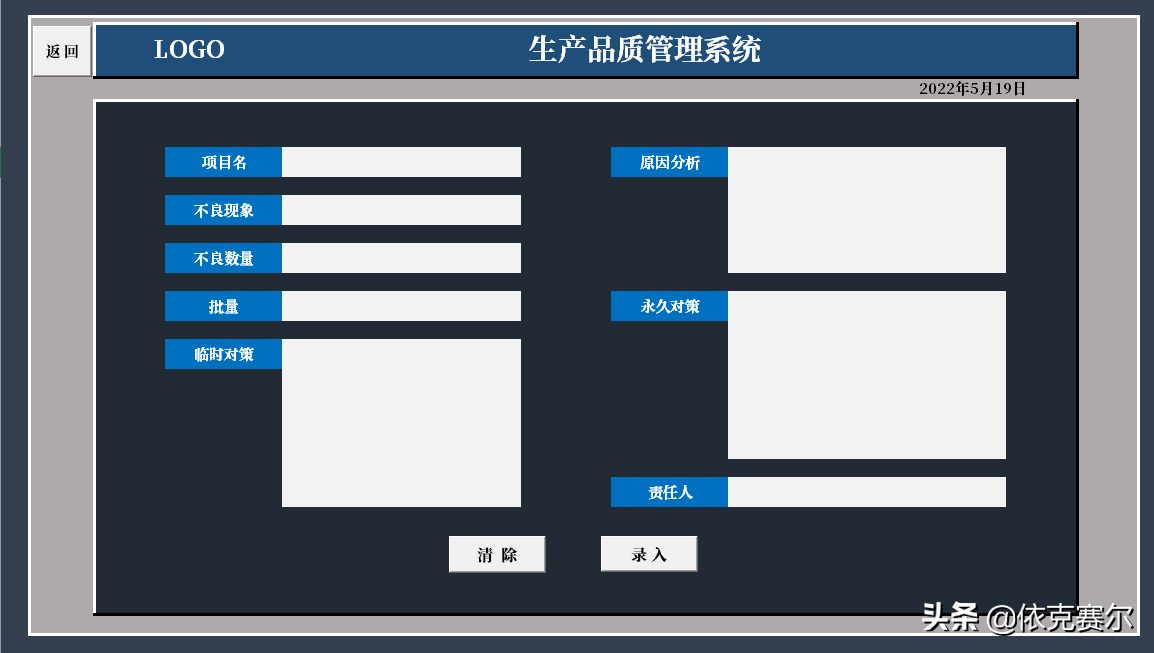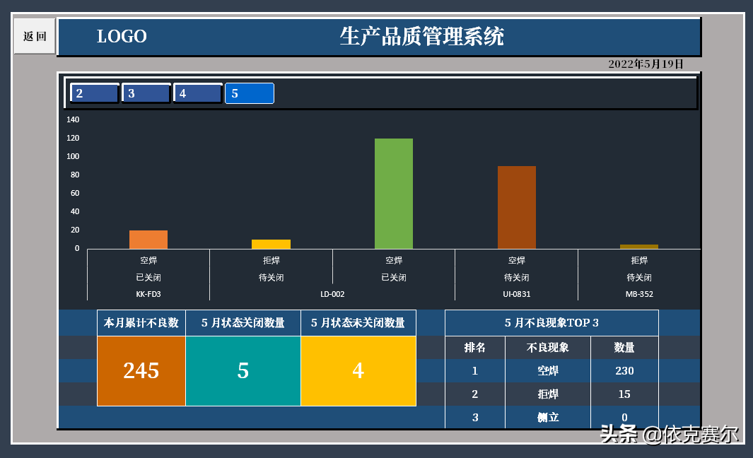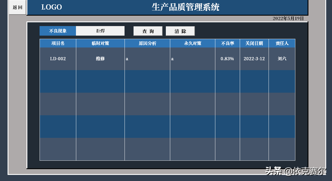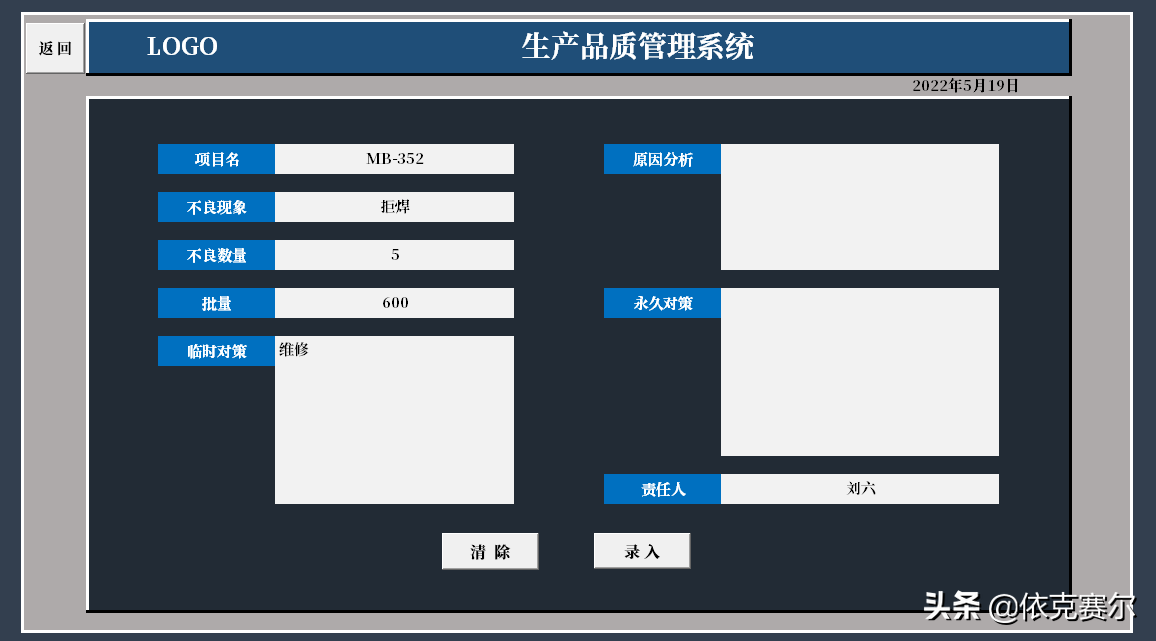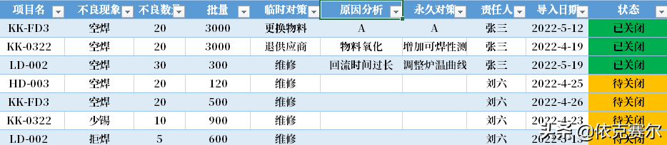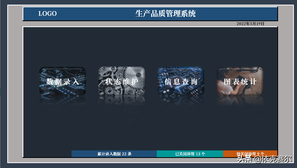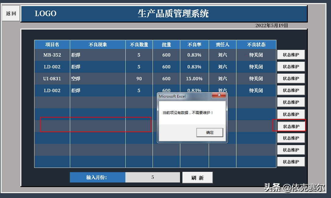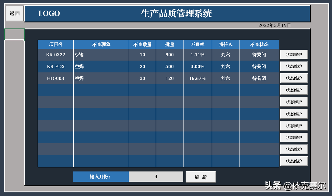 设计目的:为了方便品质异常的及时录入、异常状态的追踪更新、后期数据的查询、数据的统计汇总,方便能及时掌握每月品质异常状态。自动图表统计异常数据以利于制定有效的预防措施。