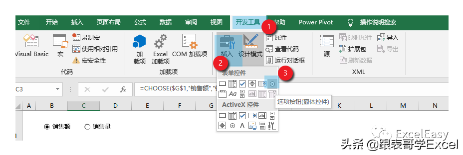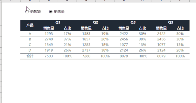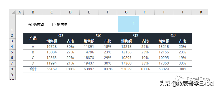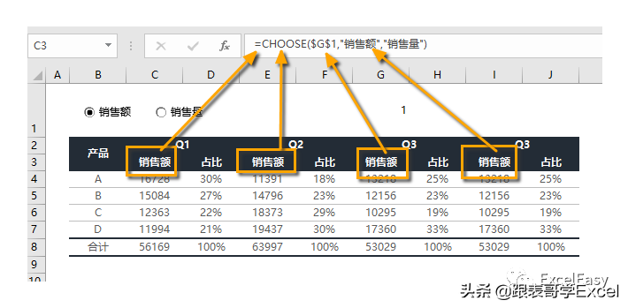 我们使用CHOOSE函数:=CHOOSE($G$1,"销售额","销售量")来根据G1的值动态选择是销售额还是销售量