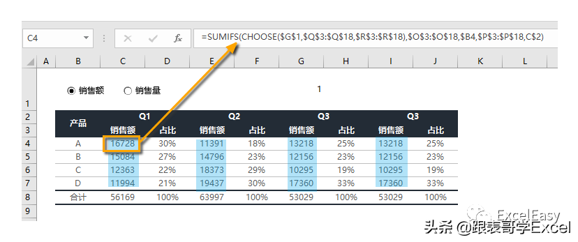 这里的公式为:=SUMIFS(CHOOSE($G$1,$Q$3:$Q$18,$R$3:$R$18),$O$3:$O$18,$B4,$P$3:$P$18,C$2)