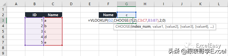 例如,我们要根据输入的名称(G2)在B3:C7区域中查找相应的ID。直接用Vlookup函数不行,所以我们通过公式: