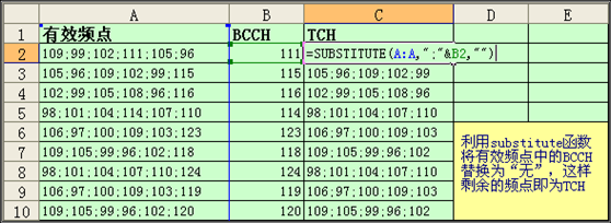 应用举例: 有些情况下在制作工参时,提取的频点信息中包含BCCH频点,因此制作TCH频点时需要将BCCH频点替换掉,例如在C2中输入“=SUBSTITUTE(A:A,";"&B2,"")”,即可把BCCH频点替换掉,如下图所示: