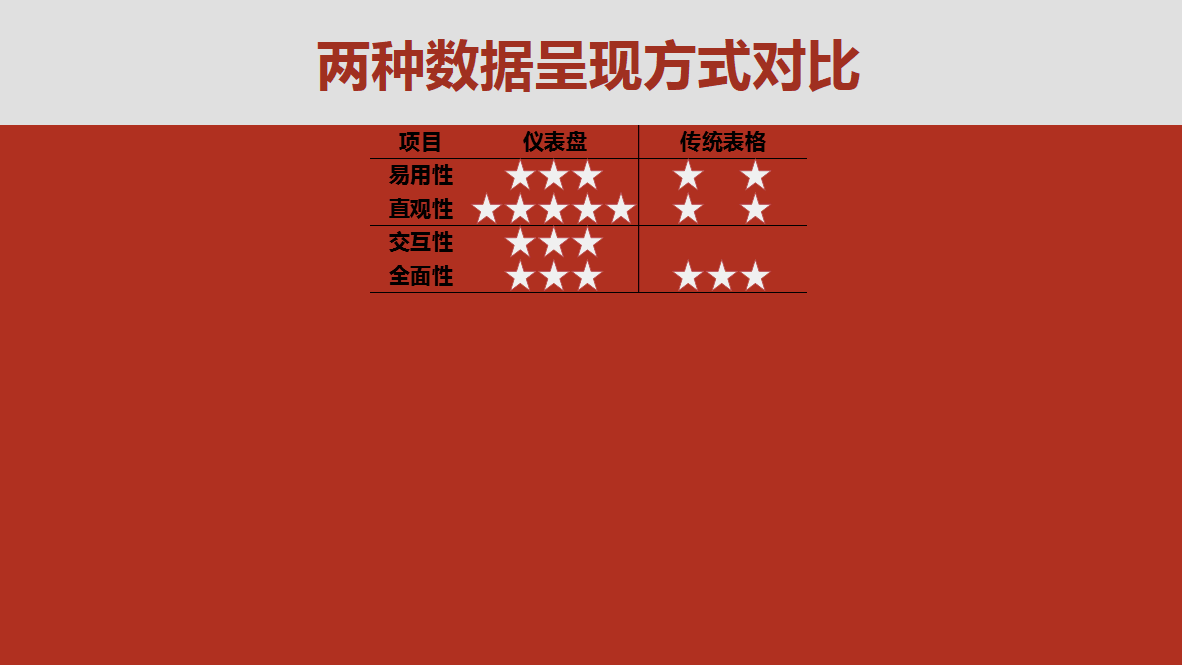 仪表盘给3星,传统表格给3星。两者虽然星级一样,但是侧重点不同,仪表盘的总数据量小,但是对数据的利用率高,能够针对现有数据,提供很多额外的信息。传统表格,虽然没能对数据进行解读,但是数据量很详实
