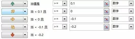 第二种图标集,是同比数值左边的这种带不同颜色的箭头,这种彩色的箭头,被用来描述品牌的同比状态。此处,共有五种不同类型和色彩的箭头
