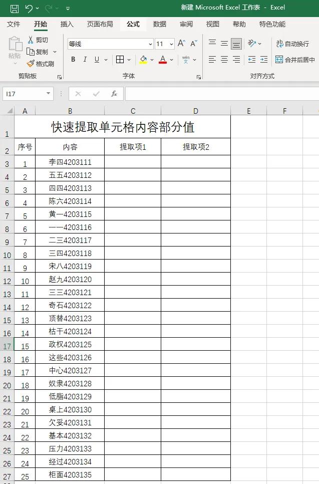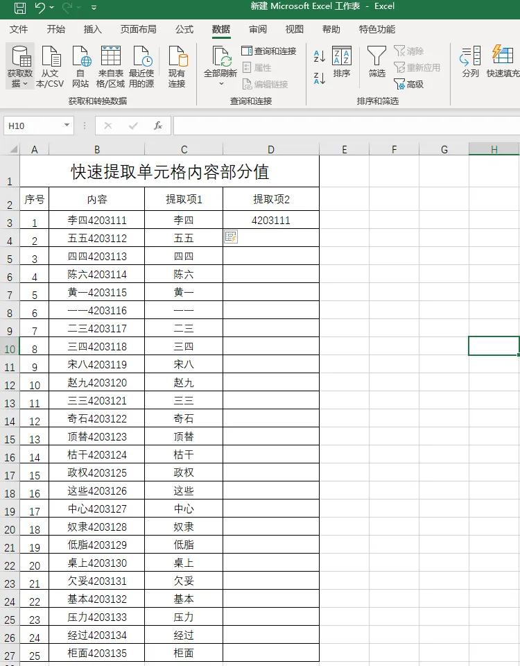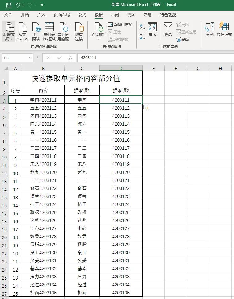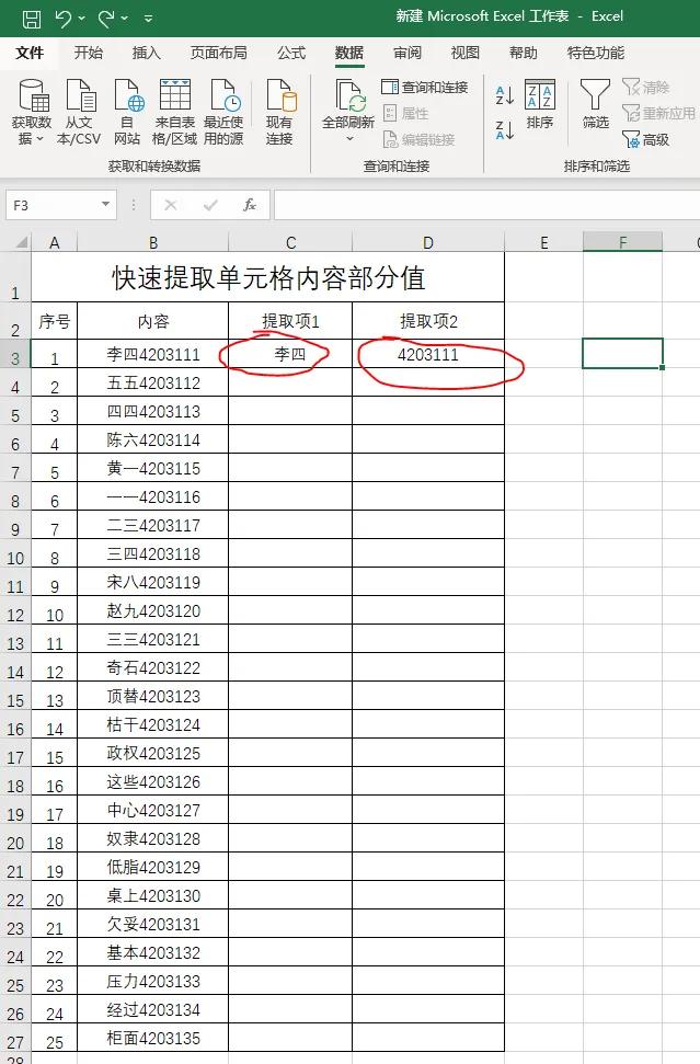 第四步:用鼠标左键选中单元格D3,重复第三步操作,将所有数字提取出来。