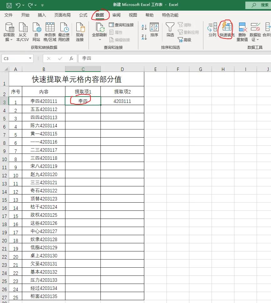 第三步:用鼠标左键选中单元格C3,然后用鼠标点击数据菜单栏,在数据菜单栏下面的工具栏中,点击快速填充图标(或者直接快捷键Ctrl+E)。这样就将所有名字提取出来了并填入对应的单元格中了。