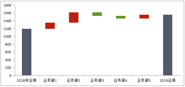 我们知道,瀑布图适用于展示各项目数值的增减变化,也就是能实现如下效果: